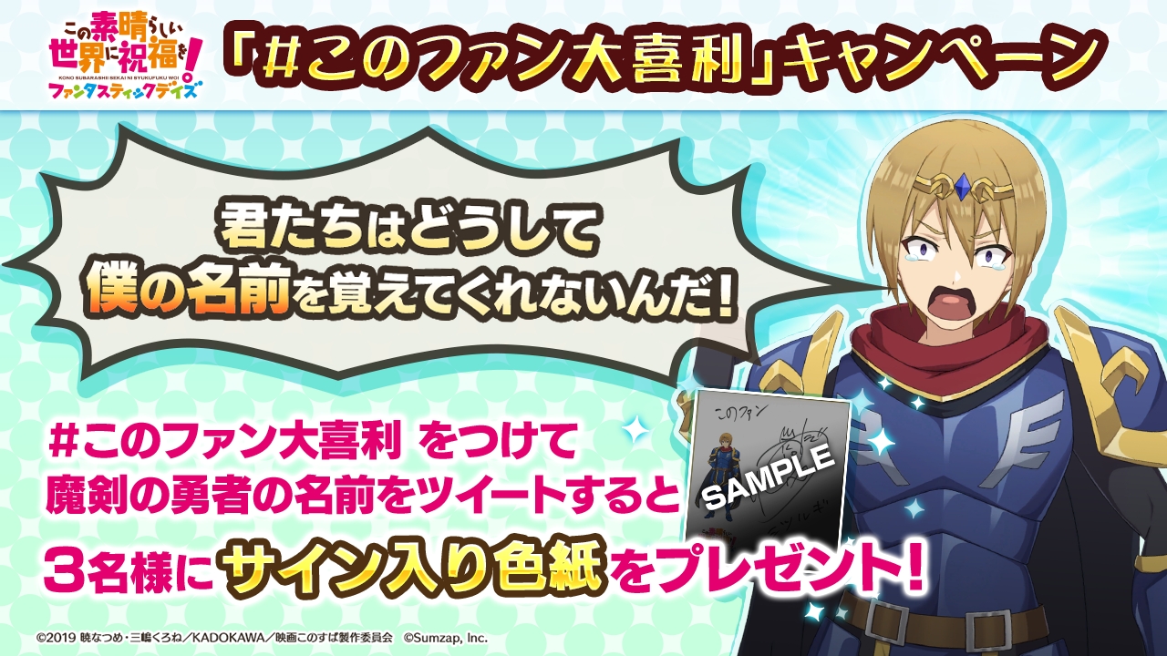 このすば 初のスマートフォンゲーム この素晴らしい世界に祝福を ファンタスティックデイズ プレイヤー数150万人突破を記念したキャンペーンを開催 江口拓也のサイン 入り色紙が当たる このファン大喜利 キャンペーンも実施 株式会社サムザップ