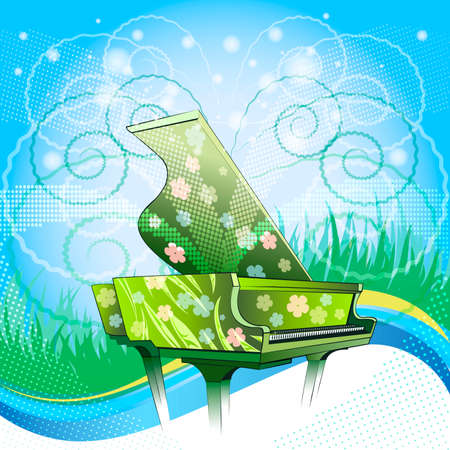 イラストでグランド ピアノのハーフトーン パターンを使用して描画される春の時間の隠喩としてお祝い自然を背景の花の絵画で覆われて のイラスト素材 ベクタ Image